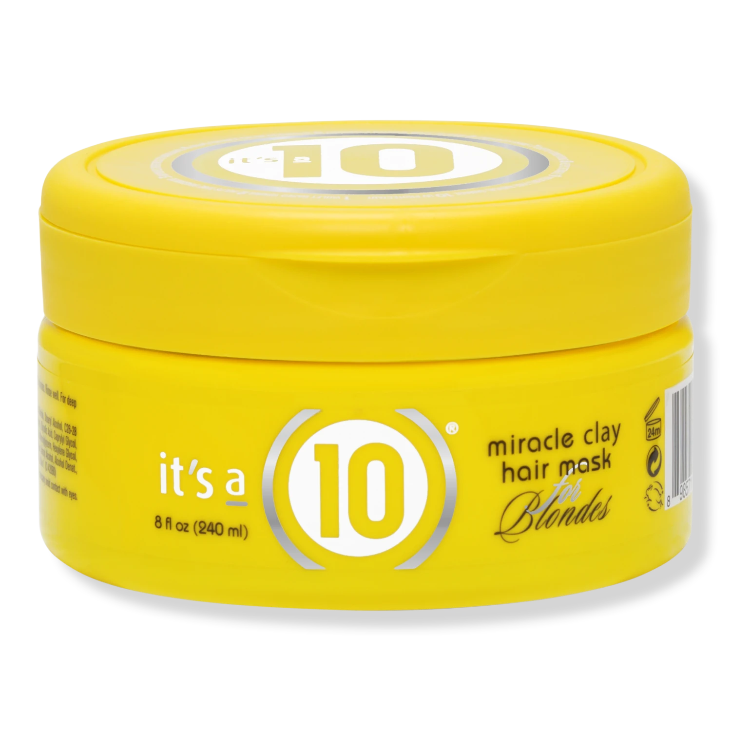 #### Benefits – Violet based toning – Helps tone brassiness – Improves brightness to highlights – Helps enhance color retention – Enhances natural body to hair – Enhances shine – Deeply conditions – Helps detangle – Prevents free radical damage – UV protectant #### Features – It’s a 10 Miracle Clay Hair Mask for Blondes is a simple treatment that restores, protects, and re-fines blonde tresses in a matter of minutes – The secret is mild, mineral-rich Kaolin Clay, which helps conditioners and other nutrients bond to the hair shaft, and then rinses away clean, leaving only strong, shiny, resilient strands. #### Key Ingredients – Kaolin Clay- A white, mineral-rich clay prized for its purity, gentleness, and moisture-imparting properties. – Avocado Oil- Deep, rich, botanical conditioner that bonds to the hair shaft and provides superior UV protection – Hydrolyzed Quinoa- A natural plant-based protein strengthens, moisturizes, and enhances shine without build up