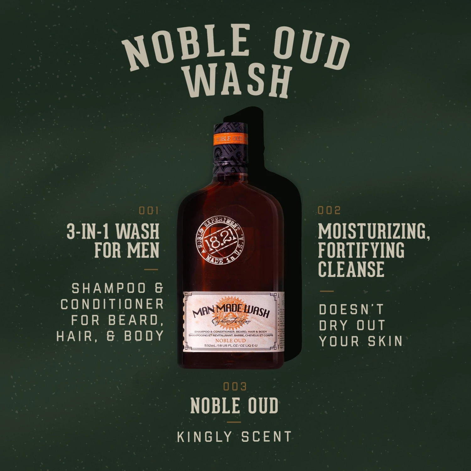 #### Features – Fortifying shampoo + conditioner for beard, hair & body – Rich lather – Gentle, sulfate free cleansing – Lightweight conditioning. – Kingly Noble Oud scent features bergamot, amber, rosewood, smoked oud and musk. #### Benefits – Fast, easy & multi-tasking – Clean, refreshed & moisturized hair & skin – No dryness or flakiness – Strengthens hair & skin. – Natural sheen. – Legendary scent. #### Key Ingredients – Jojoba, macadamia and quinoa add moisture, sheen and strength to beard, hair & skin