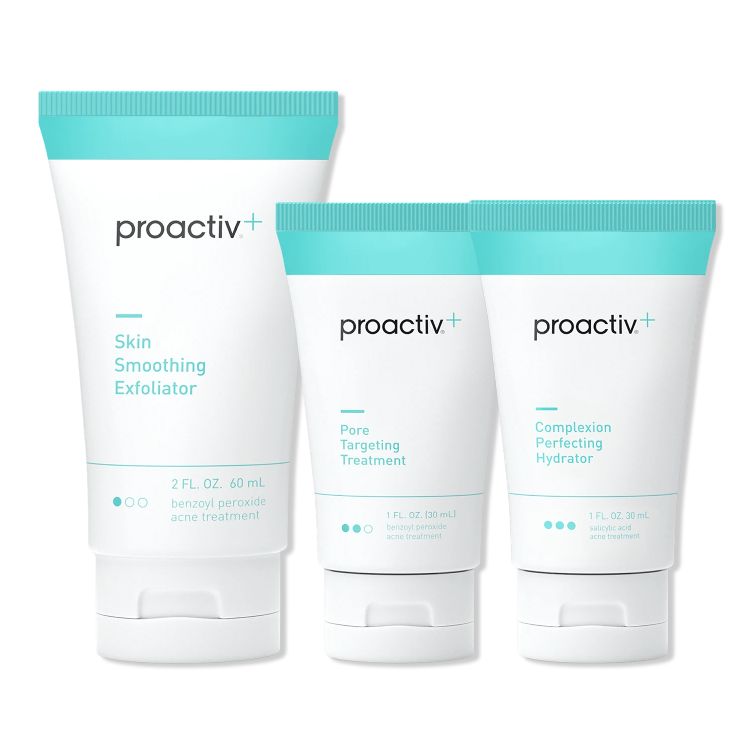 #### Features – This acne-fighting skincare routine features benzoyl peroxide to kill acne-causing bacteria with glycolic acid and salicylic acid to unclog pores and prevent breakouts – Skin Smoothing Exfoliator is formulated with microcrystal benzoyl peroxide (BPO), glycolic acid, and gentle exfoliating beads – Pore Targeting Treatment includes micronized benzoyl peroxide, engineered to dive directly and deeply into pores to kill acne-causing bacteria. #### Key Ingredients – Benzoyl peroxide – Proactiv’s prescription-grade, micronized BPO gets deep into your pores to kill acne-causing bacteria at its source. – Salicylic acid – An acne-fighting powerhouse, this beta hydroxy acid (BHA) gets deep into pores to break up oil and prevent a buildup of dead skin cells and debris. – Glycolic acid – This alpha hydroxy acid (AHA) gently exfoliates and removes dead, dry skin cells and excess oil – Hyaluronic acid – Renowned for pulling moisture into the skin, this hydrating hero helps alleviate dryness for softer, smoother-looking skin #### Includes – Skin Smoothing Exfoliator (2.0 oz) – Pore Targeting Treatment (1.0 oz) – Complexion Perfecting Hydrator (1.0 oz)